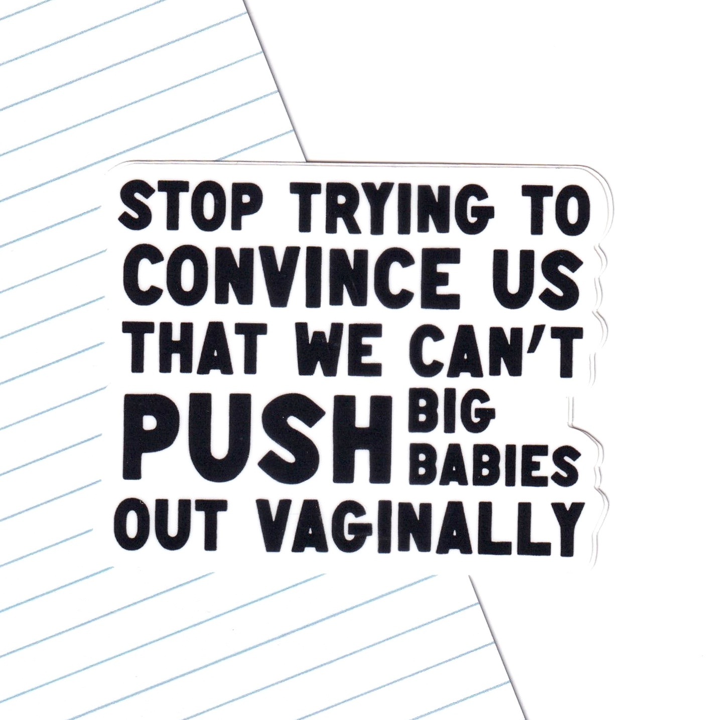 The “Stop Trying to Convince Us That We Can’t Push Big Babies Out Vaginally” sticker is a fiery response to outdated myths and fear-based messaging in maternity care. This unapologetic design calls out the bias and misinformation that often undermines a birthing person’s ability to trust their body and their birth.