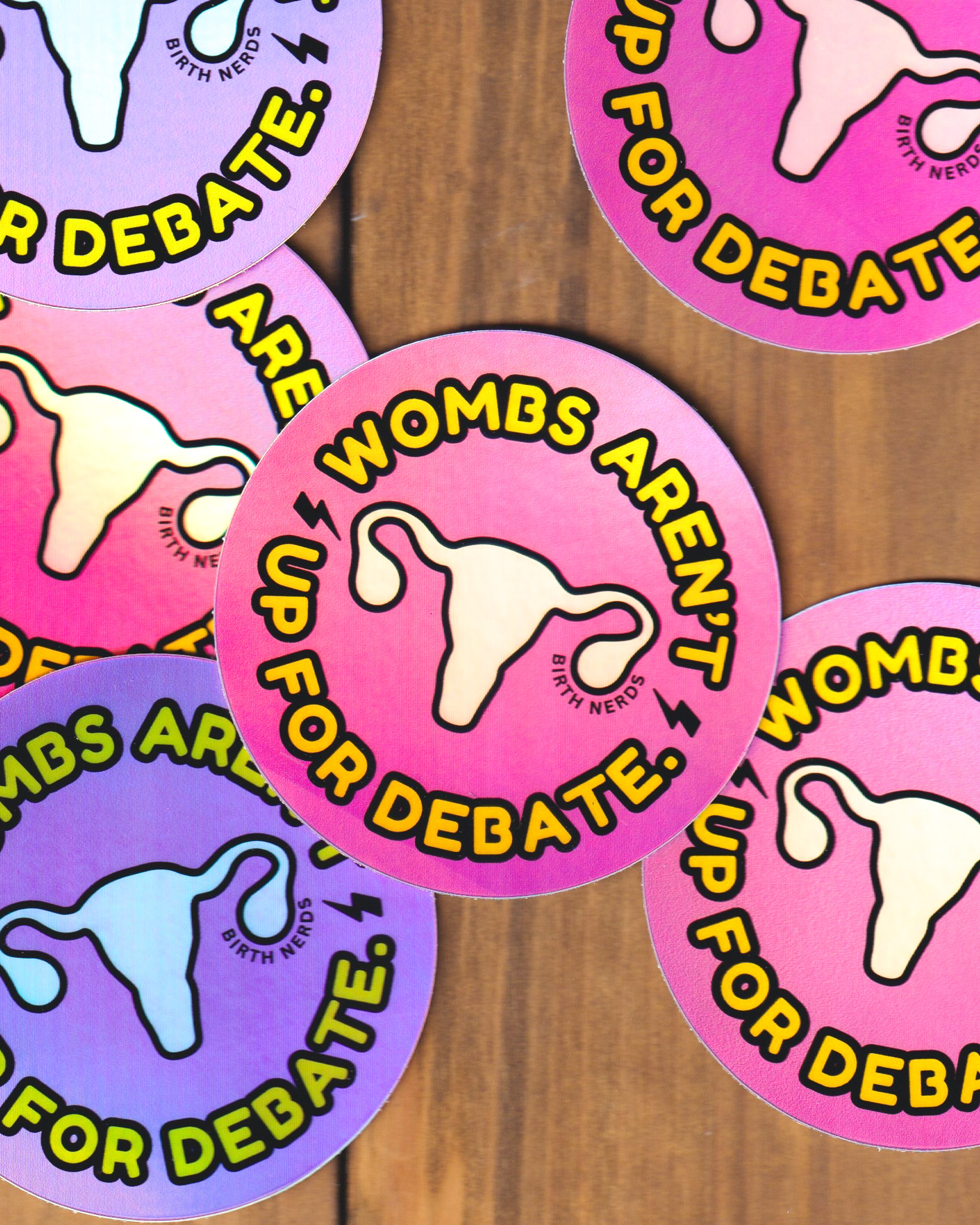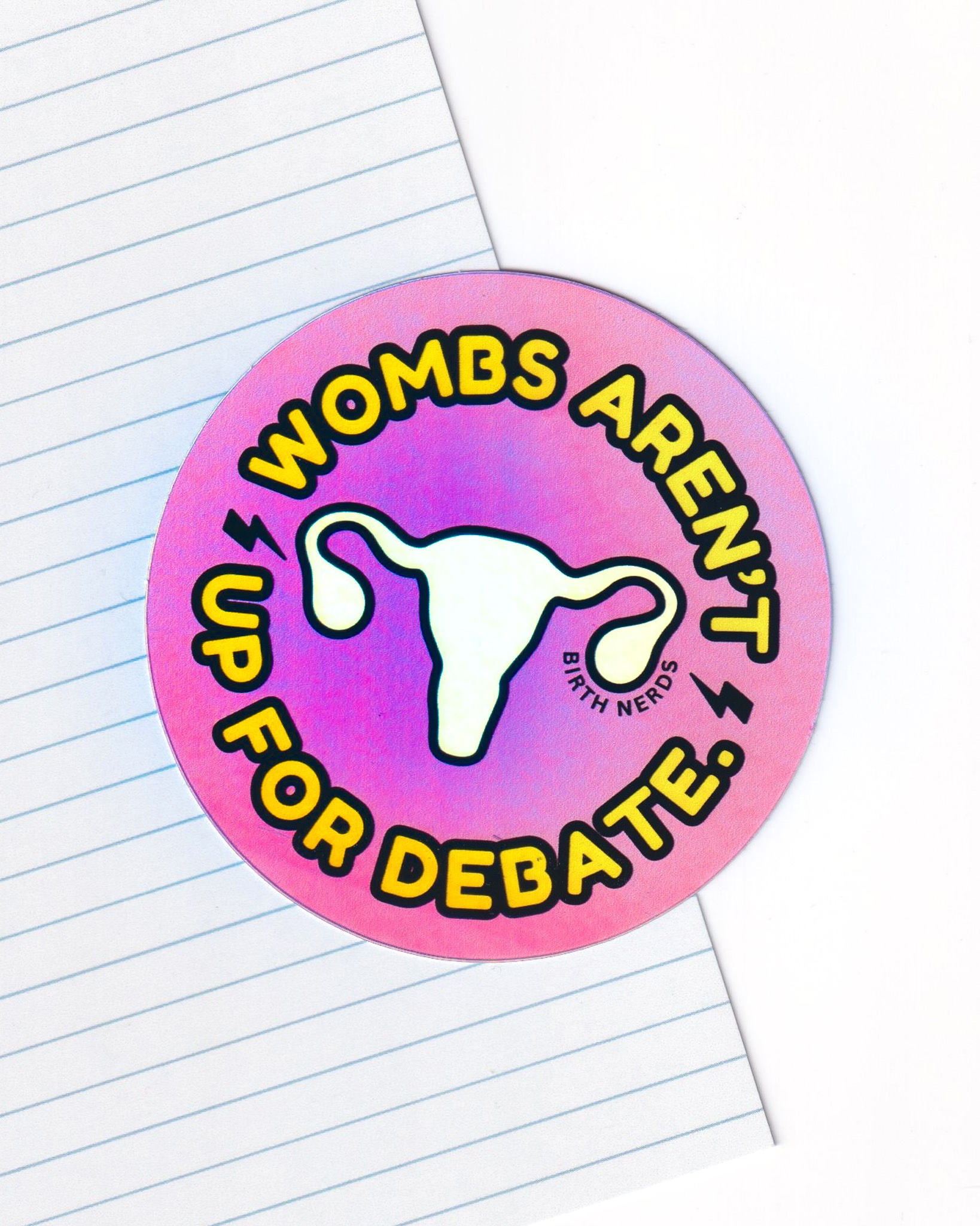 Make a bold statement with this holographic Wombs Aren’t Up for Debate sticker from Birth Nerds. Featuring a pastel rainbow uterus on a vibrant pink and purple background, this sticker shines from every angle, literally and figuratively. Perfect for laptops, water bottles, clipboards, and birth worker gear, it’s a reminder that bodily autonomy isn’t up for discussion. Durable, waterproof, and full of unapologetic energy, it’s made for advocates who stand strong for reproductive rights.